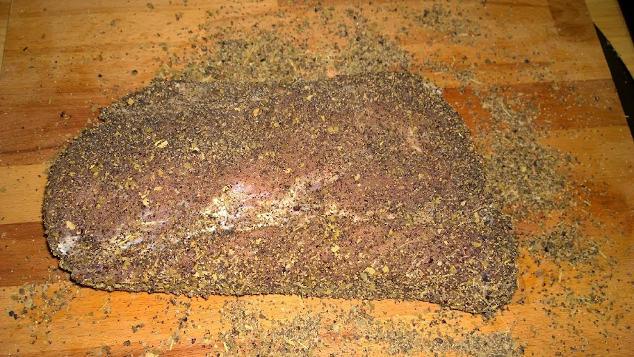 1,5 kg , dazu eine Mischung aus 300g Seesalz, Salpeter und Gewürzen