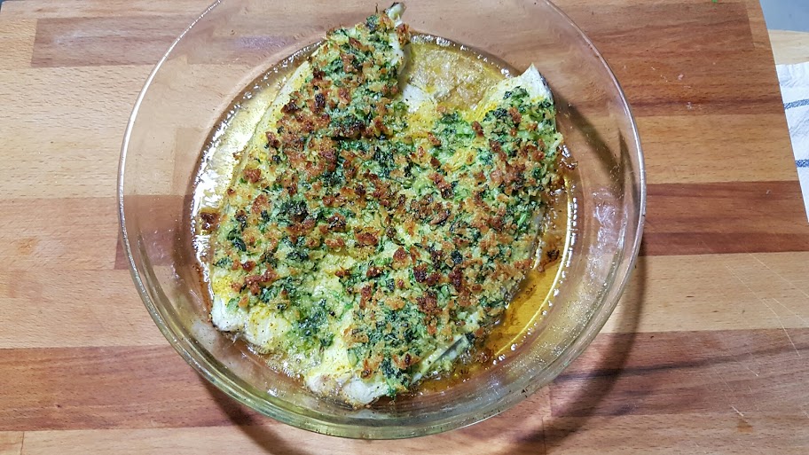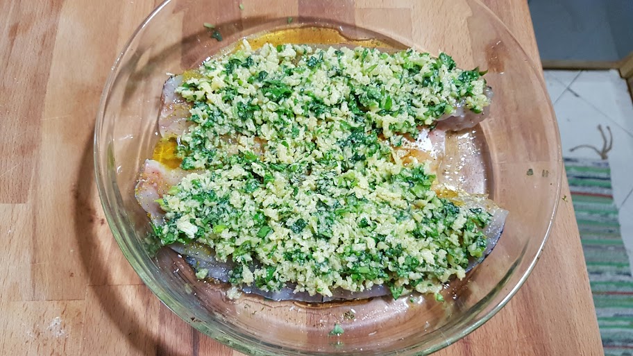 man nehme Filets und für die Kruste : Butter , Brösel , Parmesan, gehackte frische Kräuter