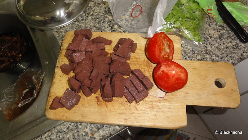 3 Weißbrotscheiben , Knoblauch , Tomaten, Paprika mit Essig und Öl mixen , mit Zucker Salz Pfeffer abschmecken , nach Gusto entweder mit Eiswasser verdünnen als kalte Speise , oder mit Wasser kurz aufkochen